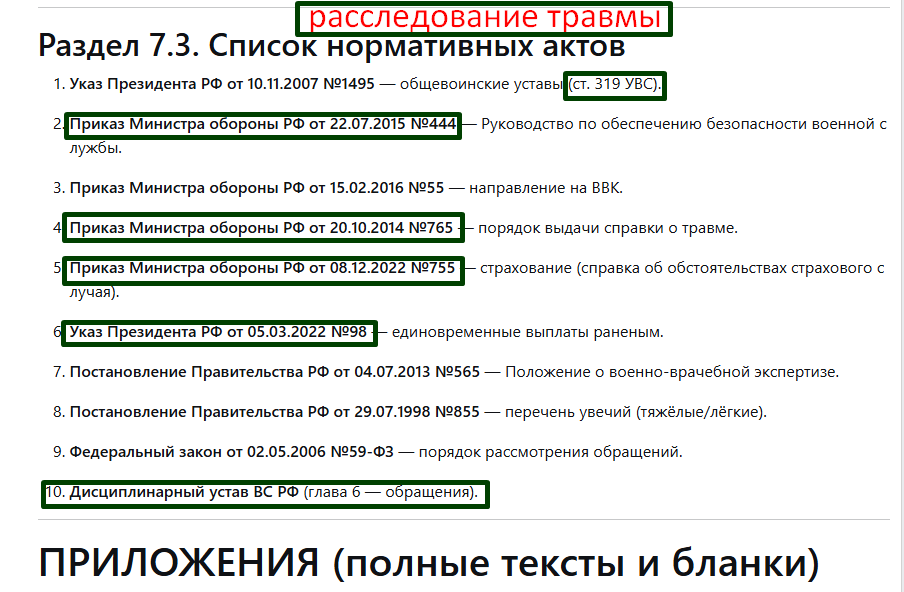 Screenshot_1619Социально значимые заболевания увольнение рапорты , приказ 506 , указ Президента 580, новый приказ 850 увольнение по категории ВСоциально значимые заболевания увольнение рапорты Приказ 506 МО указ 580 новый приказ 850 увольнение по категории В 8nTS30YPiZQСоздано: admin 25 Января 20258nTS30YPiZQПоследний ответ: admin 4 Марта 13:35 5 0 18 407Screenshot_2815рекомендации медиков -До утверждения ВВК - которое делает ЦВВК - отправляют на ЛБС рекомендации медиков 8nTS30YPiZQСоздано: admin 3 Марта 13:508nTS30YPiZQПоследний ответ: admin 3 Марта 14:51 0 0 15 25Screenshot_1682спасибки и благодарности за мою работу благодарности за мою работу Ганина Александра 8nTS30YPiZQСоздано: admin 19 Сентября 20248nTS30YPiZQПоследний ответ: admin 2 Марта 14:02 0 0 59 668Screenshot_2817Командировка или перевод отличия СВО анализ рапорты условия законность Командировка или перевод отличия СВО анализ рапорты условия законность 8nTS30YPiZQСоздано: admin 26 Февраля 10:368nTS30YPiZQПоследний ответ: admin 26 Февраля 13:05 0 0 28 32Screenshot_2435Расследование травмы - обязанность командиров,8nTS30YPiZQСоздано: admin 3 Апреля 20258nTS30YPiZQПоследний ответ: admin 22 Февраля 11:33 0 0 37 426Screenshot_2800изменения в постановление 565 о ВВК изменения в постановление 565 о ВВК 8nTS30YPiZQСоздано: admin 19 Февраля 14:078nTS30YPiZQПоследний ответ: admin 21 Февраля 12:55 1 0 6 55Screenshot_2755исполнение и ответственность за неисполнение решения Суда 8nTS30YPiZQСоздано: admin 16 Февраля 09:328nTS30YPiZQПоследний ответ: admin 20 Февраля 12:23 0 0 12 62Screenshot_2775сохранение военной пенсии мобилизованным 8nTS30YPiZQСоздано: admin 17 Февраля 13:108nTS30YPiZQПоследний ответ: admin 20 Февраля 12:18 0 0 22 52