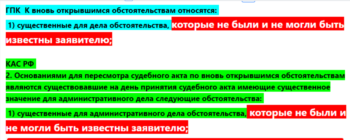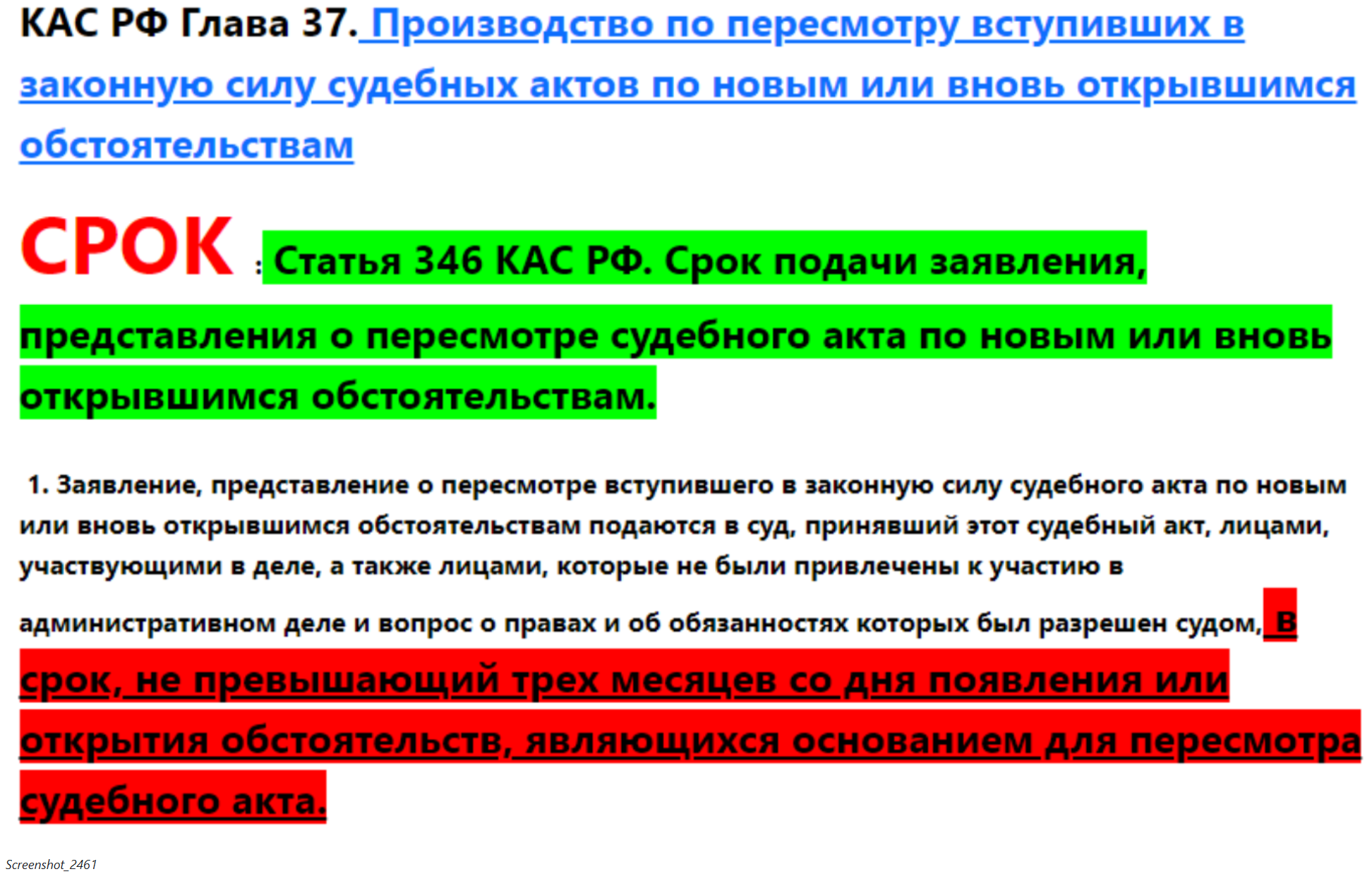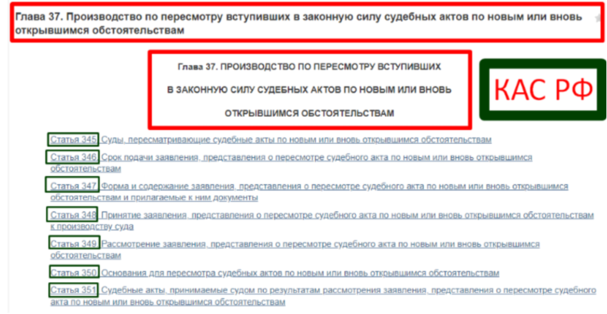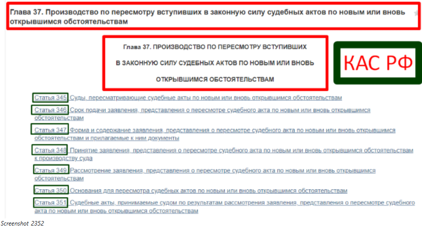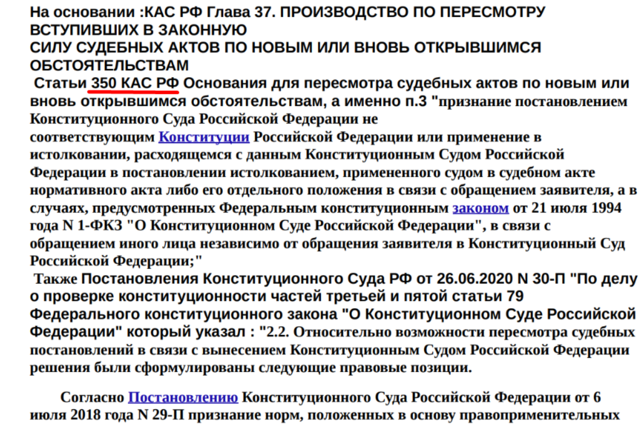 КАС РФ Главы 37. ПРОИЗВОДСТВО ПО ПЕРЕСМОТРУ ВСТУПИВШИХ В ЗАКОННУЮ СИЛУ СУДЕБНЫХ АКТОВ ПО НОВЫМ ИЛИ ВНОВЬ ОТКРЫВШИМСЯ ОБСТОЯТЕЛЬСТВАМ, Статьи 350 КАС РФ «Основания для пересмотра судебных актов по новым или вновь открывшимся обстоятельствам», а именно п.3 "признание постановлением Конституционного Суда Российской Федерации не соответствующим Конституции Российской Федерации или применение в истолковании, расходящемся с данным Конституционным Судом Российской Федерации в постановлении истолкованием, примененного судом в судебном акте нормативного акта либо его отдельного положения в связи с обращением заявителя, а в случаях, предусмотренных Федеральным конституционным законом от 21 июля 1994 года N 1-ФКЗ "О Конституционном Суде Российской Федерации", в связи с обращением иного лица независимо от обращения заявителя в Конституционный Суд Российской Федерации;"