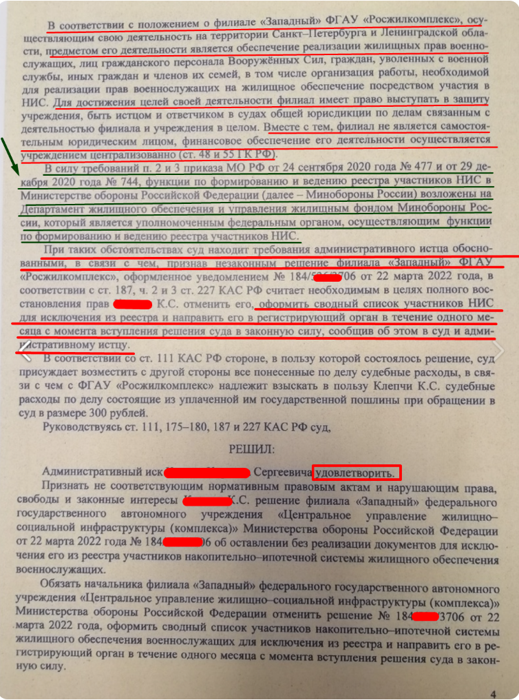 2.Обязать административных ответчиков направить оформить документы для исключения административного истца из реестра участников накопительной ипотечной системы, как добровольного участника программы жилищного обеспечения по НИС, и исключить из реестра участников накопительной ипотечной системы