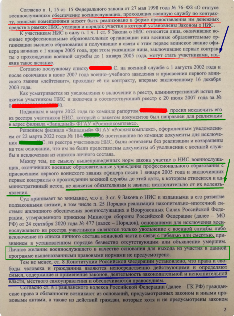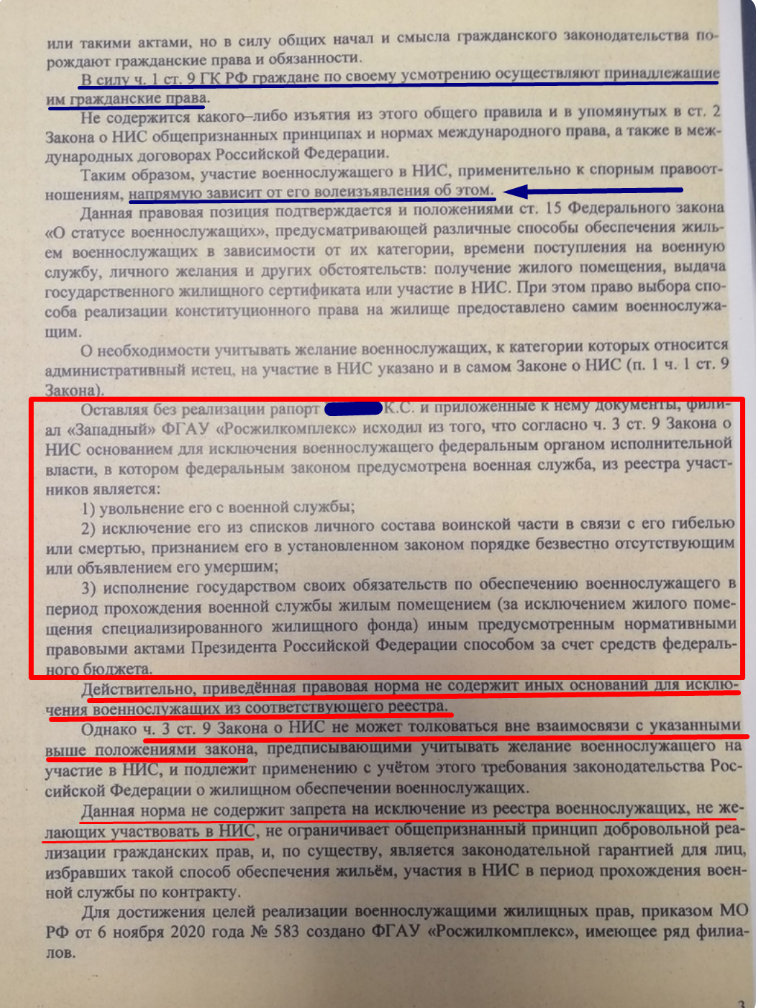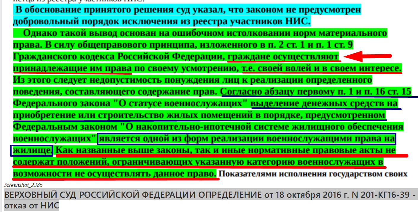 Являясь добровольным участником программы жилищного обеспечения военнослужащих "накопительная ипотечная система"( далее НИС), решил изъявить желание выйти из реестра участников НИС , подал в установленном порядке рапорт (копию прилагаю), получил ответ (копию прилагаю) с отказом, который считаю незаконным потому что : ВЕРХОВНЫЙ СУД РОССИЙСКОЙ ФЕДЕРАЦИИ В ОПРЕДЕЛЕНИИ от 1 декабря 2016 г. вN 205-КГ16-62 Определение N 205-КГ16-62 указал и сформулировал ответы и законное обоснование , почему дело аналогичное моему было принято с учетом отмены Судов предыдущих инстнаций. : "46. В том случае, если военнослужащий стал участником накопительно-ипотечной системы жилищного обеспечения по собственному желанию и не воспользовался деньгами, находящимися на его именном накопительном счете, он может быть по его просьбе исключен из реестра участников. " "Решением Тверского гарнизонного военного суда от 10 июля 2015 г., оставленным без изменения апелляционным определением Московского окружного военного суда от 24 сентября 2015 г., З. отказано в удовлетворении заявления, в котором он просил признать незаконными действия командира воинской части, связанные с отказом в оформлении документов для исключения его из реестра участников накопительно-ипотечной системы жилищного обеспечения военнослужащих (далее - НИС) и в направлении необходимых документов полномочному должностному лицу для реализации. Рассмотрев дело по кассационной жалобе З., Судебная коллегия по делам военнослужащих отменила обжалуемые судебные акты в связи с существенным нарушением норм материального права и приняла по делу новое решение, которым признала незаконными действия командира воинской части, связанные с отказом З. в оформлении документов для исключения из реестра участников накопительно-ипотечной системы жилищного обеспечения военнослужащих и обязала воинское должностное лицо оформить документы для исключения З. из реестра участников накопительно-ипотечной системы жилищного обеспечения военнослужащих. В обоснование судебная коллегия привела следующие доводы." - И далее : ". заявитель обратился к командиру воинской части с рапортом об исключении его из реестра участников НИС, изъявив желание реализовать право на получение жилого помещения иным способом, предусмотренным законом для категории военнослужащих, к которой он относится. В удовлетворении данной просьбы ему было отказано. Отказывая в удовлетворении заявления, суды исходили из того, что законом не предусмотрен добровольный порядок исключения из реестра участников НИС. Однако такой вывод основан на ошибочном истолковании норм материального права. В силу общеправового принципа, изложенного в п. 2 ст. 1 и п. 1 ст. 9 Гражданского кодекса Российской Федерации, граждане осуществляют принадлежащие им права по своему усмотрению, то есть своей волей и в своем интересе. Из этого следует недопустимость понуждения лиц к реализации определенного поведения, составляющего содержание прав. Согласно абзацу первому п. 1 и п. 16 ст. 15 Федерального закона "О статусе военнослужащих" выделение денежных средств на приобретение или строительство жилых помещений в порядке, предусмотренном Федеральным законом "О накопительно-ипотечной системе жилищного обеспечения военнослужащих" является одной из форм реализации военнослужащими прав