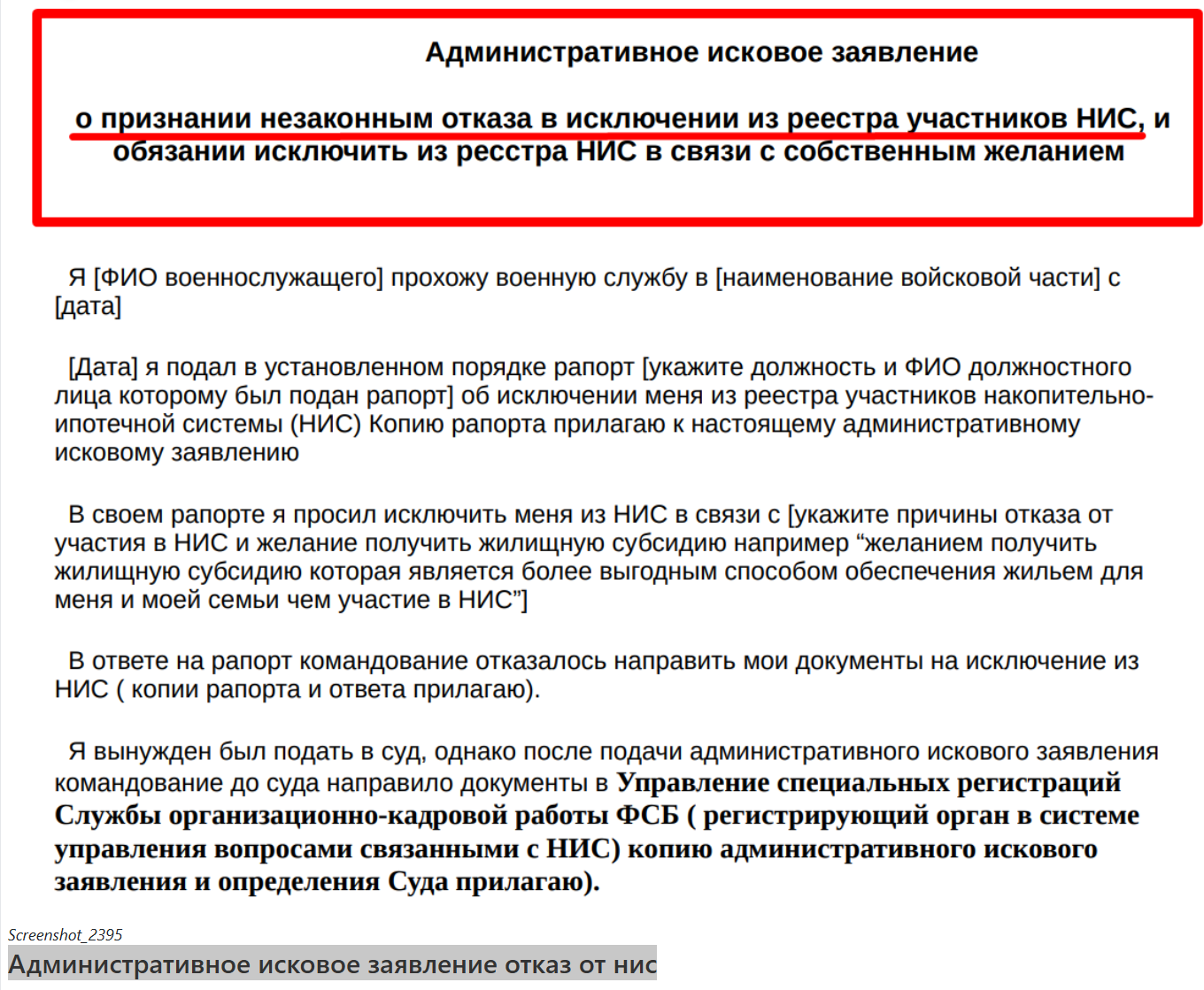 - И далее : ". заявитель обратился к командиру воинской части с рапортом об исключении его из реестра участников НИС, изъявив желание реализовать право на получение жилого помещения иным способом, предусмотренным законом для категории военнослужащих, к которой он относится. В удовлетворении данной просьбы ему было отказано. Отказывая в удовлетворении заявления, суды исходили из того, что законом не предусмотрен добровольный порядок исключения из реестра участников НИС.