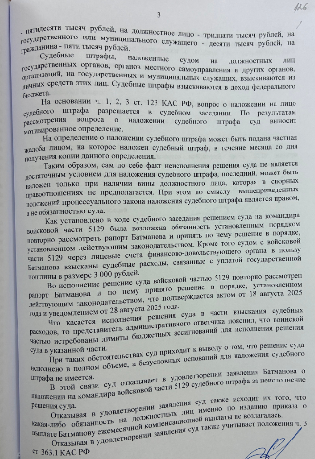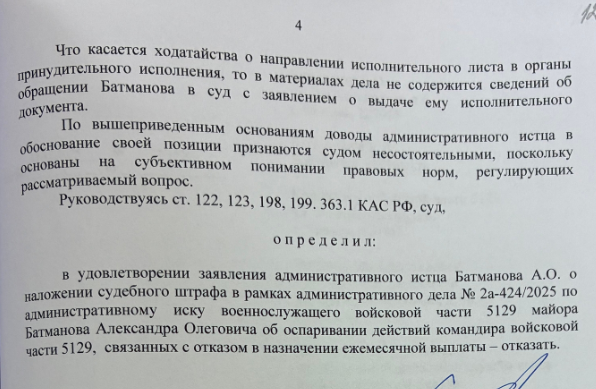 ситуация проясняется. Судья в определении от 22 декабря 2025 года прямо указал: "какая-либо обязанность на должностных лиц именно по изданию приказа о выплате Батманову ежемесячной компенсационной выплаты не возлагалась". Суд обязал только "повторно рассмотреть" рапорт, что командир формально и сделал (акт от 18.08.2025, уведомление от 28.08.2025).