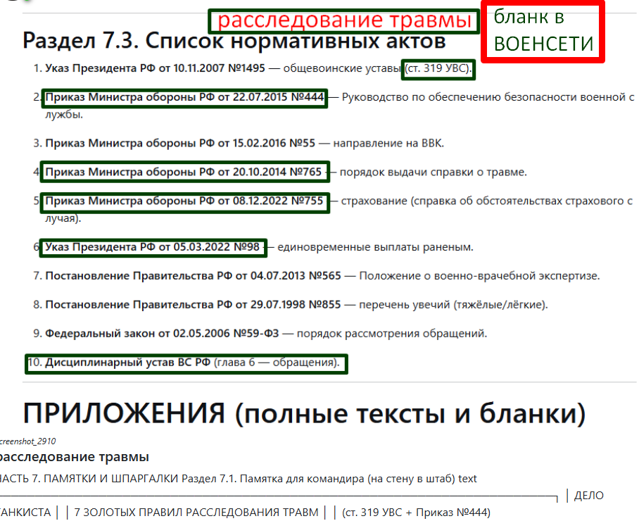 Приложение №1. Рапорт о расследовании травмы (ДЕЛО ТАНКИСТА) Приложение №2. Рапорт о расследовании заболевания Приложение №3. Рапорт о направлении на ВВК Приложение №4. Объяснение свидетеля (под Приказ 444) Приложение №5. Ходатайство о вызове свидетелей Приложение №6. Ходатайство о назначении СМЭ (с вопросами) Приложение №7. Жалоба вышестоящему командиру Приложение №8. Жалоба в военную прокуратуру Приложение №9. Административный иск о бездействии командира Приложение №10. Заключение по итогам расследования (форма Приложения №13 к Приказу 444) с комментариями Приложение №11. Памятка на стену Приложение №12. Памятка военнослужащему Приложение №13. Список нормативных актов