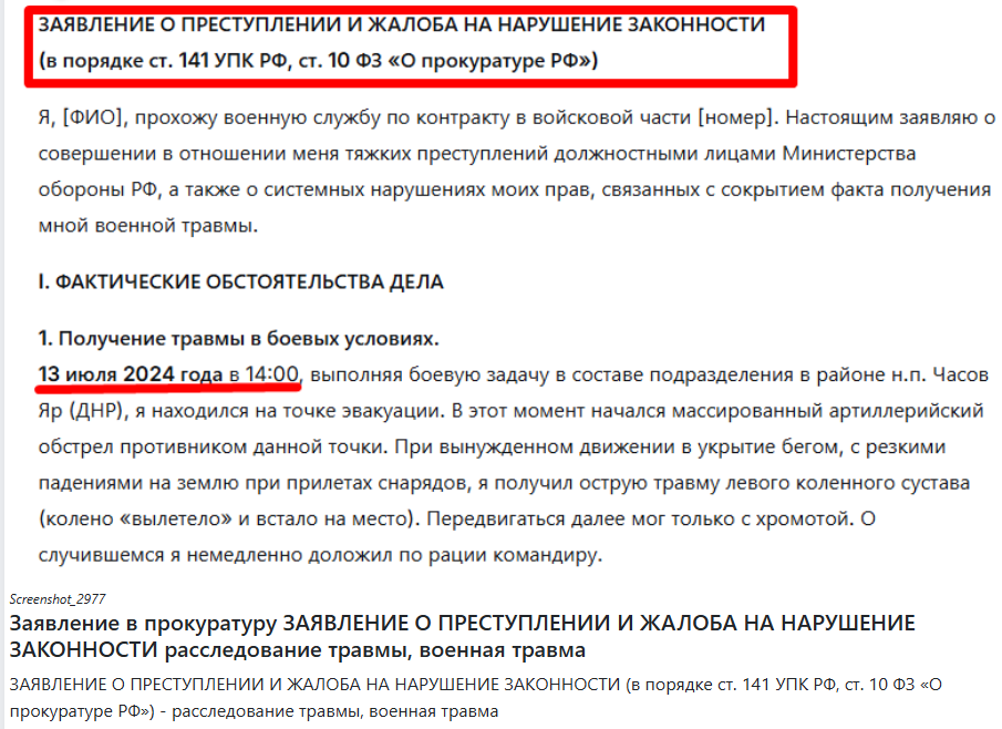 Докладываю, что мною изучены материалы служебного разбирательства по факту получения мной травмы 13.07.2024 в районе н.п. Часов Яр ДНР. В данном разбирательстве содержатся фактические и юридические ошибки, которые нарушают мои права и препятствуют признанию травмы военной.