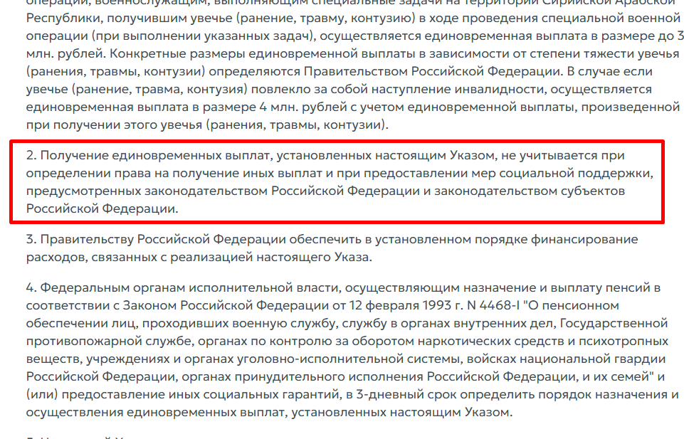 2. Получение единовременных выплат, установленных настоящим Указом, не учитывается при определении права на получение иных выплат и при предоставлении мер социальной поддержки, предусмотренных законодательством Российской Федерации и законодательством субъектов Российской Федерации.