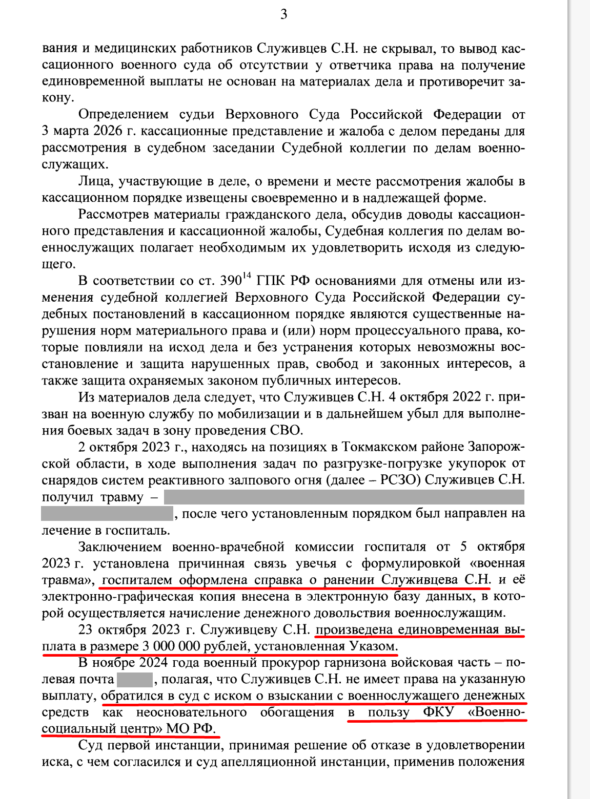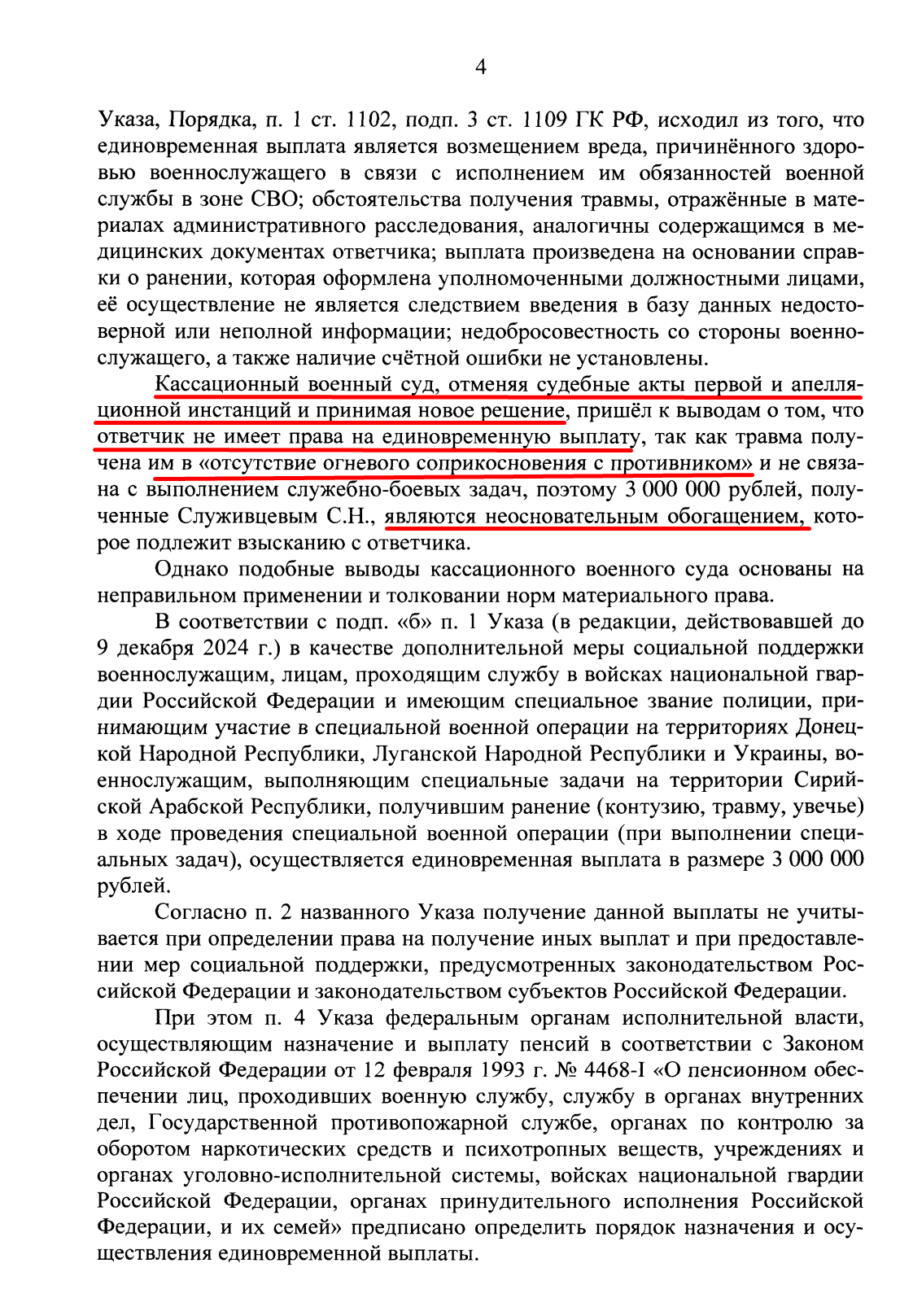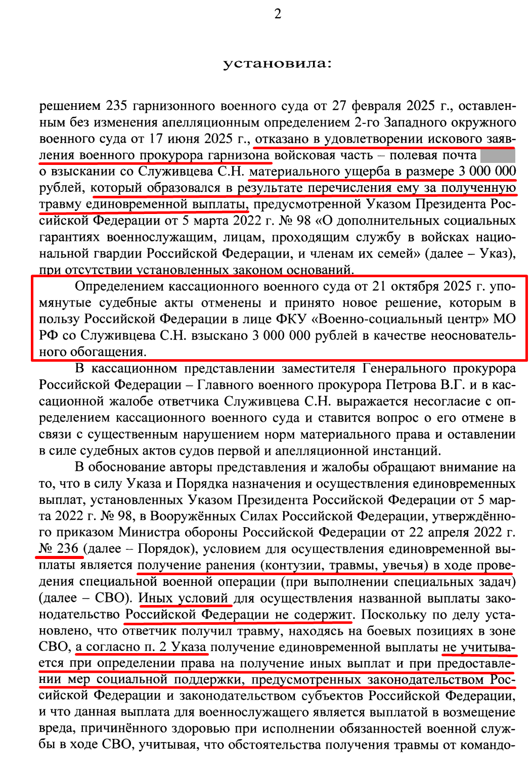 *«Ни Указ № 98, ни Приказ МО № 236 не требуют для выплаты 3 млн ни „огневого контакта“, ни записи в журнале боевых действий, ни „правильности действий“ военнослужащего. Единственное условие — получение травмы в зоне СВО при исполнении задач. Моя травма этому условию соответствует. Иск о возврате денег как неосновательного обогащения противоречит правовой позиции Верховного Суда РФ, изложенной в определениях № 223-КАД23-5-К10 от 07.12.2023 и № 222-КГ26-1-К10 от 31.03.2026»*.