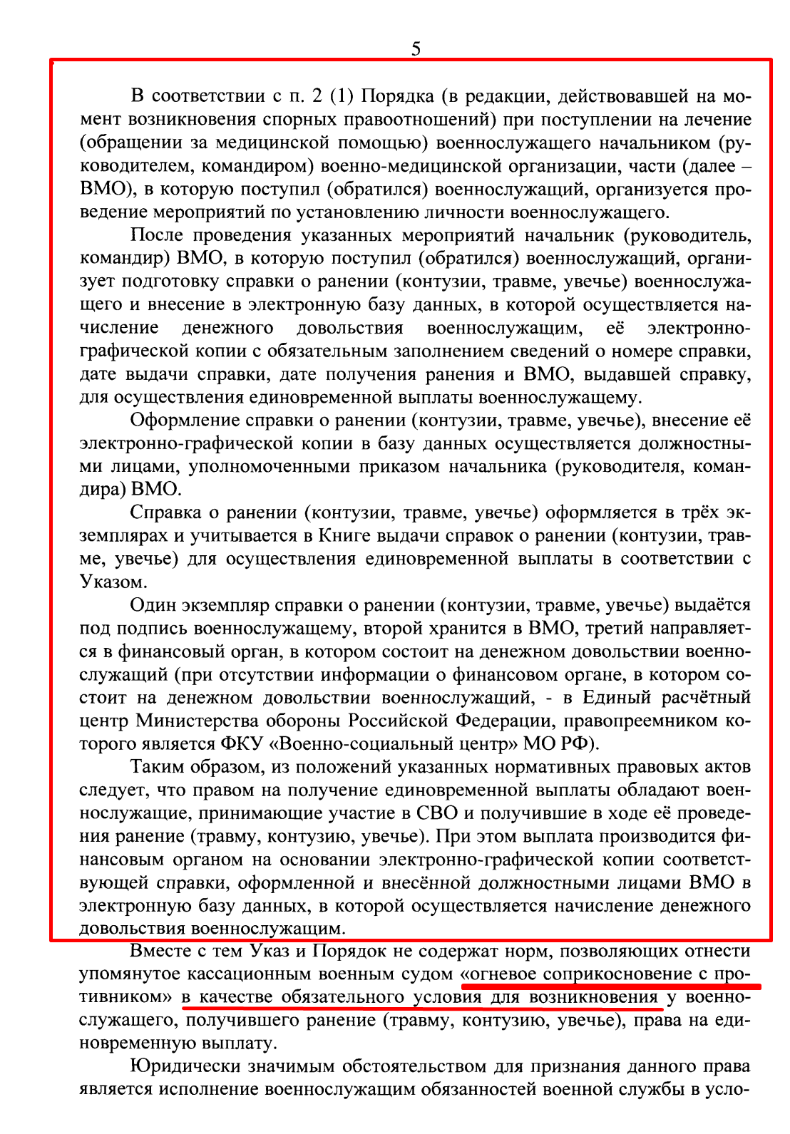 «Указ и Порядок не содержат норм, позволяющих отнести „огневое соприкосновение с противником“ в качестве обязательного условия для возникновения права на выплату. Юридически значимым обстоятельством является исполнение обязанностей военной службы в условиях проводимой СВО».