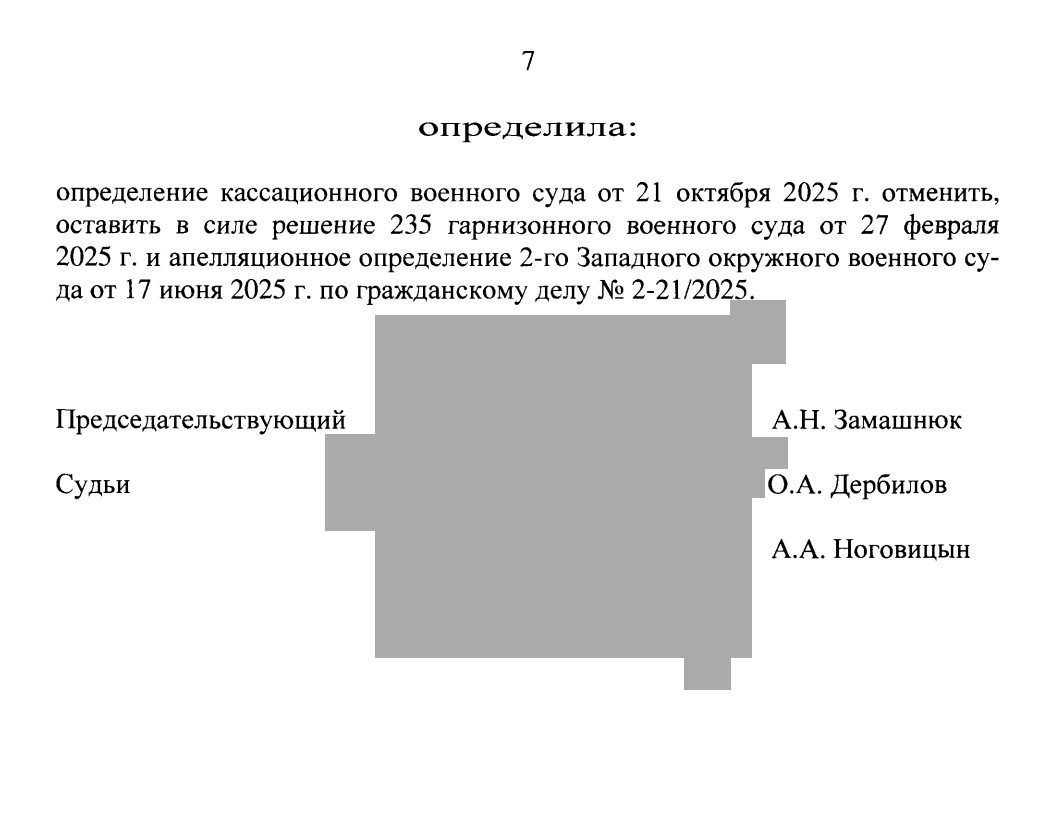 | Кассационный военный суд | «Поддерживаем прокурора, деньги надо вернуть» | НЕ ПРАВ. Определение отменено. |