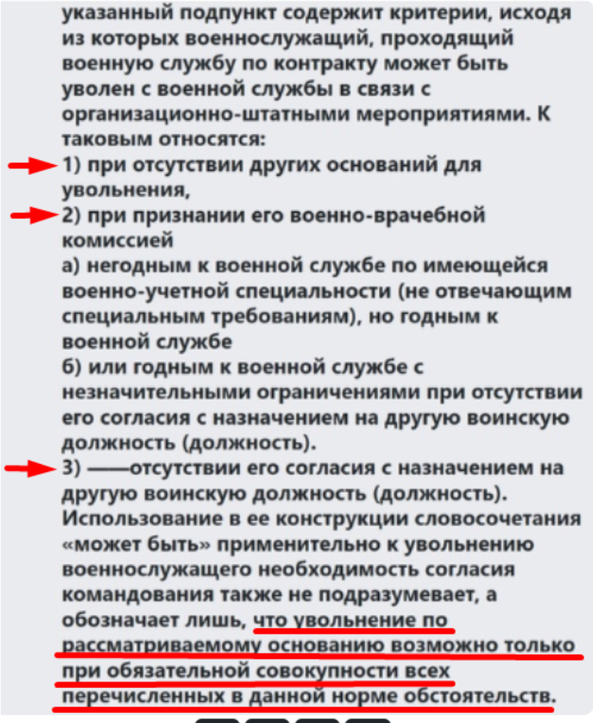 не понял ? вот Вы пишете : В вашем случае речь идёт не о неисполнении приказа, а об отказе в увольнении по определённому основанию --- а в указе верховного главнокомандующего четко прописано : "Статья 34. Порядок увольнения военнослужащих с военной службы и исключения их из списков личного состава воинской части 4. Военнослужащий, проходящий военную службу по контракту, может быть досрочно уволен с военной службы: а) в связи с организационно-штатными мероприятиями (подпункт "а" пункта 2 статьи 51 Федерального закона) и при отсутствии других оснований для увольнения: при сокращении занимаемой им воинской должности (должности), невозможности назначения на равную воинскую должность (должность) и отсутствии его согласия с назначением на высшую или низшую воинскую должность (должность); по истечении сроков нахождения в распоряжении командира (начальника), установленных пунктом 4 статьи 42 Федерального закона и настоящим Положением, при невозможности назначения на равную воинскую должность (должность) и отсутствии его согласия с назначением на высшую или низшую воинскую должность (должность); при снижении воинского звания, предусмотренного по занимаемой им воинской должности (должности), и (или) месячного оклада в соответствии с занимаемой им воинской должностью (должностью) и нежелании продолжать военную службу на занимаемой им воинской должности (должности), а также при невозможности назначения на равную воинскую должность (должность) и отсутствии его согласия с назначением на высшую или низшую воинскую должность (должность); при признании его военно-врачебной комиссией не годным к военной службе по имеющейся военно-учетной специальности (не отвечающим специальным требованиям), но годным к военной службе или годным к военной службе с незначительными ограничениями при отсутствии его согласия с назначением на другую воинскую должность (должность);" соответственно отказ есть прямое нарушение Указа Президента