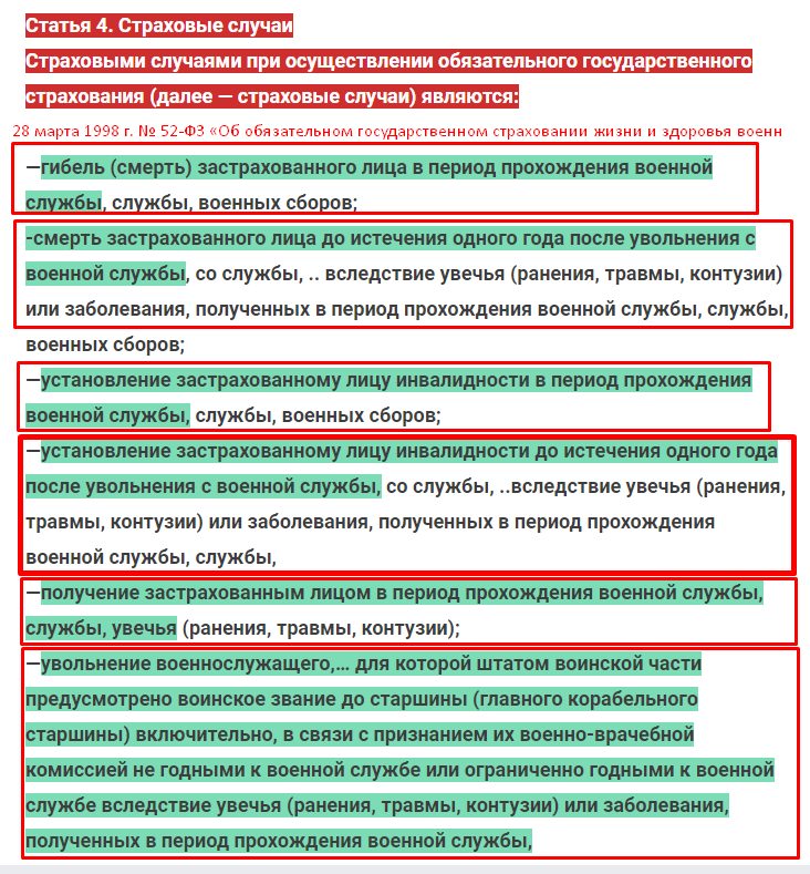 1. Гибель (смерть) военнослужащего или гражданина, призванного на военные сборы, наступившей при исполнении им обязанностей военной службы, либо его смерти, наступившей вследствие увечья (ранения, травмы, контузии) или заболевания, полученных им при исполнении обязанностей военной службы (военная травма), до истечения одного года со дня увольнения с военной службы (отчисления с военных сборов или окончания военных сборов)