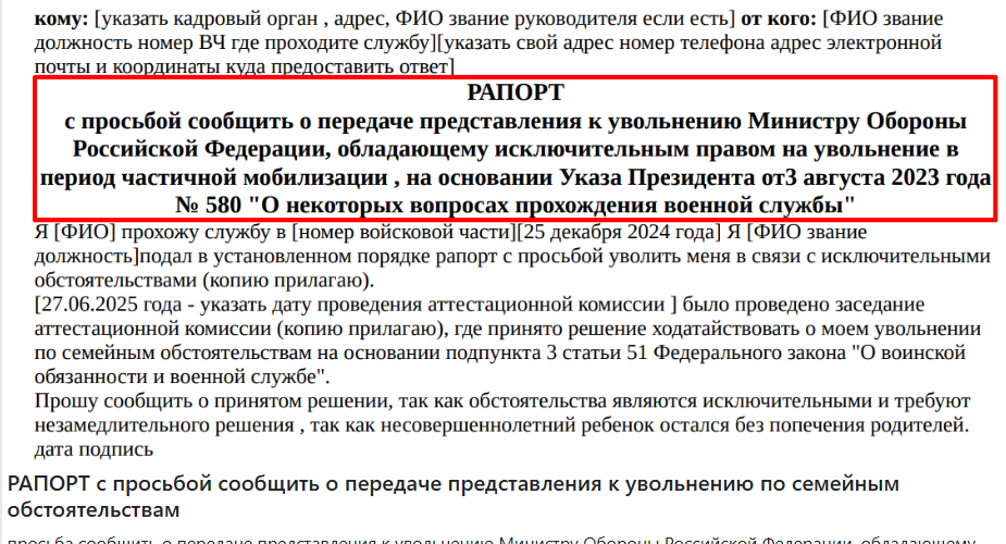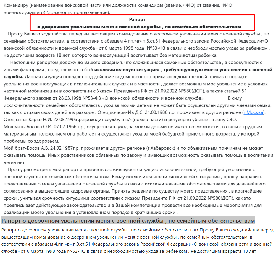 Прошу Вашего ходатайства перед вышестоящим командование о досрочном увольнении меня с военной службы , по семейным обстоятельствам, в соответствии с абзацем 4,пп.»в»,п.3,ст.51 Федерального закона Российской Федерации»О воинской обязанности и военной службе» от 6 марта 1998 года №53-ФЗ в связи с необходимостью ухода за ребенком , не достигшим возраста 18 лет, которого веннослужащий воспитывает без матери(отца) ребенка. Настоящим рапортом довожу до Вашего сведения, что сложившиеся семейные обстоятельства , в совокупности с иными факторами , представляют собой исключительную ситуацию , требующующую моего увольнения с военной службы. Данная ситуация попадает под действие ведомственного приказа»ведомственный приказ о порядке увольнения военнослужащих в исключительных случаях и в частности , делает возможным мое увольнение в условиях частичной мобилизации в соответствии с Указом Президента РФ от 21.09.2022 №580(ДСП), а также статьей 51 Федерального закона от 28.03.1998 №53-ФЗ «О воинской обязанности и военной службе». В силу исключительности семейных обстоятельств , уход за моими детьми не может быть осуществлен другими членами семьи, так как с отцами своих детей я в разводе . Отец дочери-Ив Д.С. 21.08.1986 г.р. проживает в другом регионе (г.Москва). Отец сына-Карко Н.И. 22.05.1995г.р.проходит службу в в/ч(номер части) и регулярно убывает в зону СВО. Моя мать-Босова О.И. 07.02.1966 г.р., осуществлять уход за моими детьми не имеет возможности , в связи с трудным материальным положением она работает и осуществляет уход за моей бабушкой приклонного возраста, у которой проблемы со здоровьем. Мой брат-Босов А.В. 24.02.1987г.р. проживает в другом регионе (г.Хабаровск) и по объективным причинам не может оказывать помощь. Иных родственников обязанных по закону и имеющих возможность оказывать помощь в воспитании детей нет. Прошу;рассмотреть мой рапорт и признать сложившуюся ситуацию исключительной, требующей увольнения с военной службы по семейным обстоятельствам. Ввиду исключительности сложившейся ситуации , прошу направить представление о моем увольнении с военной службы в связи с исключительными обстоятельствами для дальнейшего согласования в вышестоящие кадровые органы. Принять решение по существу моего представления , в кратчайшие сроки , учитывая срочность ситуации,в соответствии с Указом Президента РФ от 21.09.2022 №580(ДСП), как это предписывает действующее законодательство и в Вашей компетенции провести все необходимые мероприятия для реализации моего увольнения в установленном порядке в кратчайшие сроки . Приложения: 1. Свидетельства о рождении детей. 2. Свидетельства о разводе . 3. Справки из мед. Учреждения . Дата. Звание Подпись