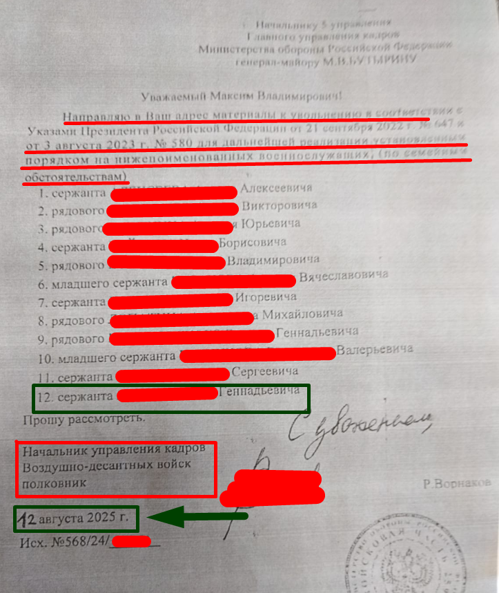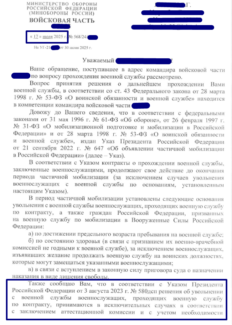 с просьбой сообщить о передаче представления к увольнению Министру Обороны Российской Федерации, обладающему исключительным правом на увольнение в период частичной мобилизации , на основании Указа Президента от3 августа 2023 года № 580 "О некоторых вопросах прохождения военной службы"