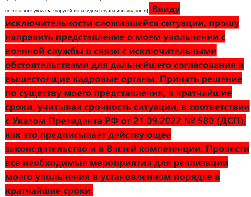 Настоящим рапортом довожу до Вашего сведения, что сложившиеся семейные обстоятельства, в совокупности с иными факторами, представляют собой исключительную ситуацию, требующую моего увольнения с военной службы. Данная ситуация подпадает под действие ведомственного приказа № [указать номер приказа, если известен, если нет, то можно указать “ведомственный приказ о порядке увольнения военнослужащих в исключительных случаях”], и в частности, делает возможным мое увольнение в условиях частичной мобилизации в соответствии с Указом Президента РФ от 21.09.2022 № 580 (ДСП), а также статьей 51 Федерального закона от 28.03.1998 N 53-ФЗ “О воинской обязанности и военной службе”. Моя супруга, [ФИО супруги], [дата рождения], является инвалидом [указать группу инвалидности] вследствие [указать заболевание или причину инвалидности], что подтверждается справкой об инвалидности от [дата выдачи], № [номер справки], выданной [наименование органа]. В соответствии с заключением [наименование медицинского учреждения или комиссии], выданным [дата выдачи] № [номер заключения], моей супруге необходим постоянный посторонний уход ввиду [указать конкретные причины, например: “ограниченной подвижности”, “неспособности к самообслуживанию”, “необходимости постоянного приема лекарственных препаратов и наблюдения”, “психологического состояния”]. В силу исключительной тяжести семейных обстоятельств, уход за моей супругой не может быть обеспечен другими членами семьи, так как [описать причины с подробностями, например: “родители преклонного возраста и сами имеют серьезные проблемы со здоровьем, нуждаясь в постоянном уходе”, “другие родственники проживают в другом регионе/стране, и по объективным причинам не могут оказывать помощь”, “у супруги нет других близких родственников”]. Данное положение усугубляется [описать дополнительные факторы, осложняющие ситуацию, например: “одиночество супруги”, “финансовые трудности”, “отсутствие возможности получения социальной помощи”]. Таким образом, я являюсь единственным лицом, способным обеспечить необходимый постоянный уход и помощь моей супруге, а также гарантировать ее безопасность и благополучие. Невозможность исполнения служебных обязанностей в полном объеме, в связи с необходимостью неотлучного ухода за супругой, ставит под угрозу здоровье и благополучие моей супруги, а также негативно сказывается на моей способности добросовестно исполнять воинский долг. На основании подпункта “в” пункта 1 статьи 51 Федерального закона от 28.03.1998 N 53-ФЗ “О воинской обязанности и военной службе” и учитывая вышеописанные исключительные обстоятельства, а также в соответствии с Указом Президента РФ от 21.09.2022 № 580 (ДСП), ПРОШУ: Рассмотреть настоящий рапорт и признать сложившуюся ситуацию исключительной, требующей моего увольнения с военной службы по семейным обстоятельствам в связи с необходимостью постоянного ухода за супругой-инвалидом [группа инвалидности]. Ввиду исключительности сложившейся ситуации, прошу направить представление о моем увольнении с военной службы в связи с исключительными обстоятельствами для дальнейшего согласования в вышестоящие кадровые органы. Принять решение по существу моего представления, в кратчайшие сроки, учитывая срочность ситуации, в соответствии с Указом Президента РФ от 21.