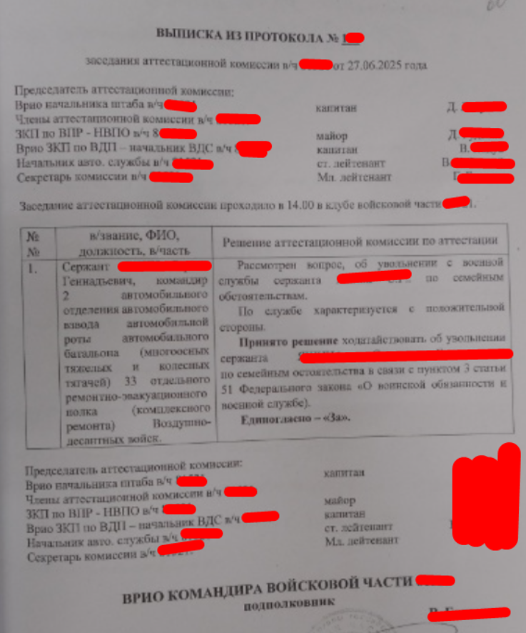 [27.06.2025 года - указать дату проведения аттестационной комиссии ] было проведено заседание аттестационной комиссии (копию прилагаю), где принято решение ходатайствовать о моем увольнении по семейным обстоятельствам на основании подпункта 3 статьи 51 Федерального закона "О воинской обязанности и военной службе".