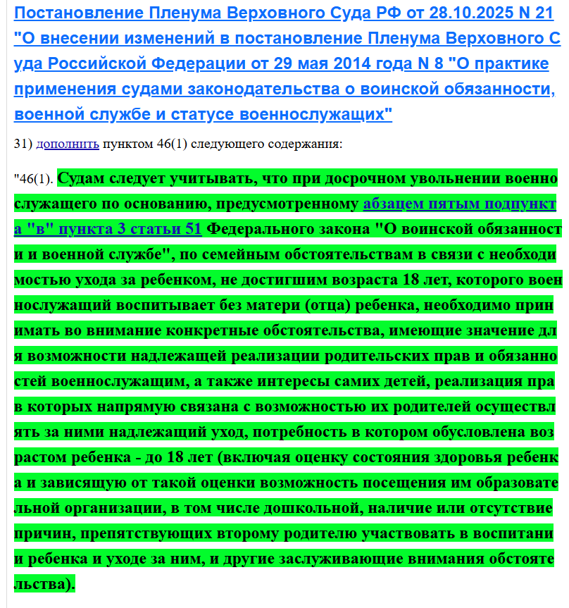 "46(1). Судам следует учитывать, что при досрочном увольнении военнослужащего по основанию, предусмотренному абзацем пятым подпункта "в" пункта 3 статьи 51 Федерального закона "О воинской обязанности и военной службе", по семейным обстоятельствам в связи с необходимостью ухода за ребенком, не достигшим возраста 18 лет, которого военнослужащий воспитывает без матери (отца) ребенка, необходимо принимать во внимание конкретные обстоятельства, имеющие значение для возможности надлежащей реализации родительских прав и обязанностей военнослужащим, а также интересы самих детей, реализация прав которых напрямую связана с возможностью их родителей осуществлять за ними надлежащий уход, потребность в котором обусловлена возрастом ребенка - до 18 лет (включая оценку состояния здоровья ребенка и зависящую от такой оценки возможность посещения им образовательной организации, в том числе дошкольной, наличие или отсутствие причин, препятствующих второму родителю участвовать в воспитании ребенка и уходе за ним, и другие заслуживающие внимания обстоятельства).
