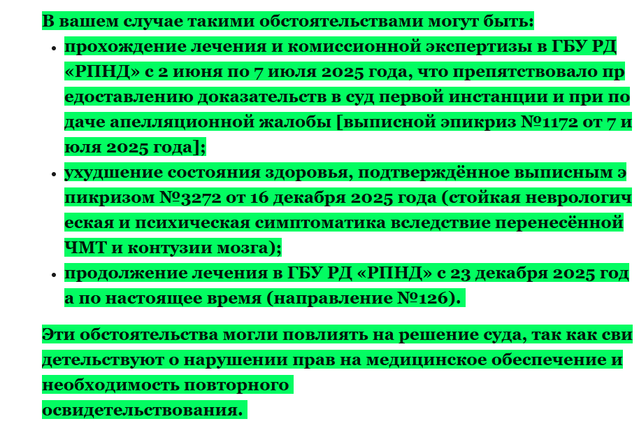 • ухудшение состояния здоровья, подтверждённое выписным эпикризом №3272 от 16 декабря 2025 года (стойкая неврологическая и психическая симптоматика вследствие перенесённой ЧМТ и контузии мозга);