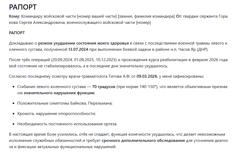 Я, гвардии сержант Гораков Сергей Александрович, прохожу амбулаторное лечение в связи с последствиями военной травмы левого коленного сустава, полученной 13.07.2024 при исполнении обязанностей военной службы в условиях боевой обстановки.