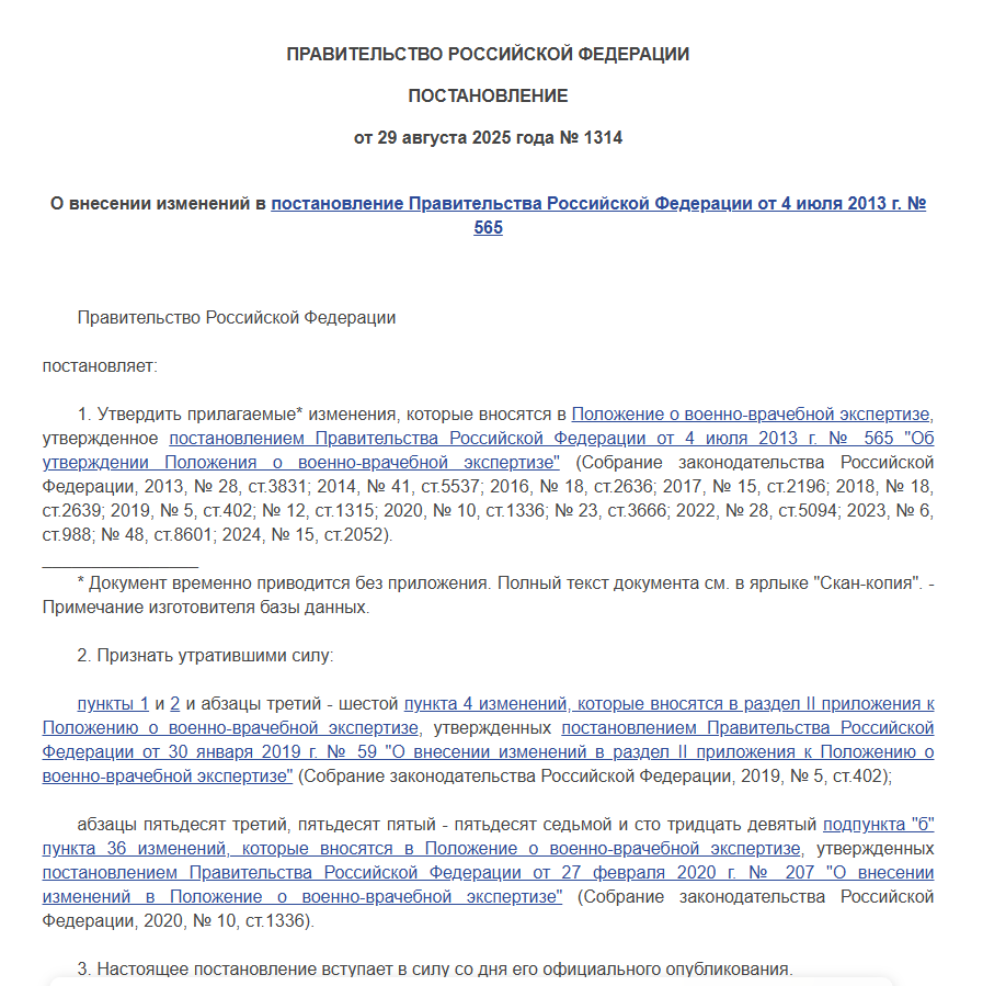 — Постановление Правительства РФ от 04.07.2013 N 565 «Об утверждении Положения о военно-врачебной экспертизе» (далее Положение).