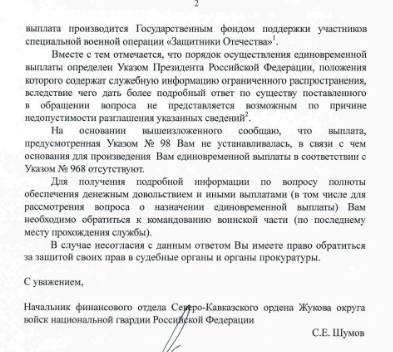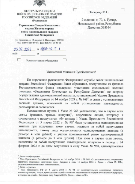 "Не та дверь": Росгвардия рассматривает ваше обращение, поступившее из фонда «Защитники Отечества». Но, судя по логике новых приказов, фонд должен был сам заняться вашей выплатой по Указу № 968 (как за старые ранения), либо перенаправить вас в Военно-социальный центр МО РФ. Вместо этого они просто переслали обращение в Росгвардию, а та дала отписку, сосредоточившись на отсутствии выплаты по Указу № 98.