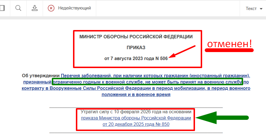 Прежде всего, зафиксируем ключевой факт: с 10 февраля 2026 года (дата вступления в силу после регистрации в Минюсте) прекратил действовать приказ Минобороны РФ № 506 от 07.08.2023, и начал действовать новый приказ № 850 от 20.12.2025 . Это два разных документа, и путаница возникает именно из-за кардинально изменившегося подхода.
